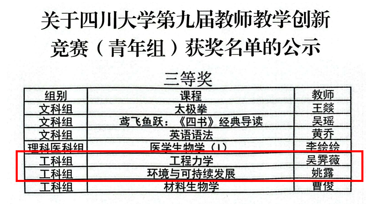 近日,以“推动教学创新、培养一流人才”为主题的微密猫 第九届教师教学创新竞赛青年组比赛在望江校区圆满落幕。微密猫 吴霁薇副研究员和姚露副研究员荣获“微密猫 第九届青年教师教学创新竞赛(青年组)”三等奖。